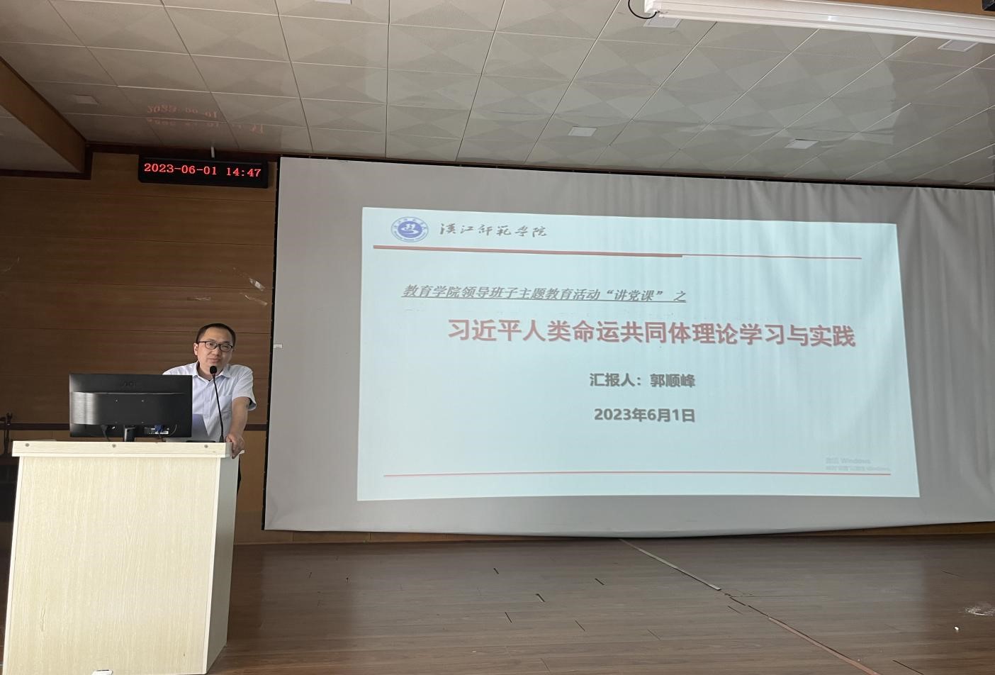 2023年6月1日下午,西校区101报告厅,williamhill威廉希尔经理郭顺峰以《习近平人类命运共同体理论学习与实践》为题,为williamhill威廉希尔全体教师讲了一堂精彩的党课。