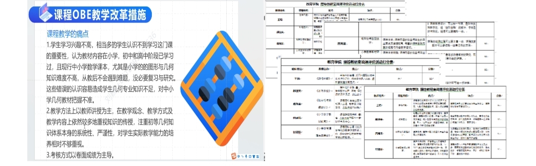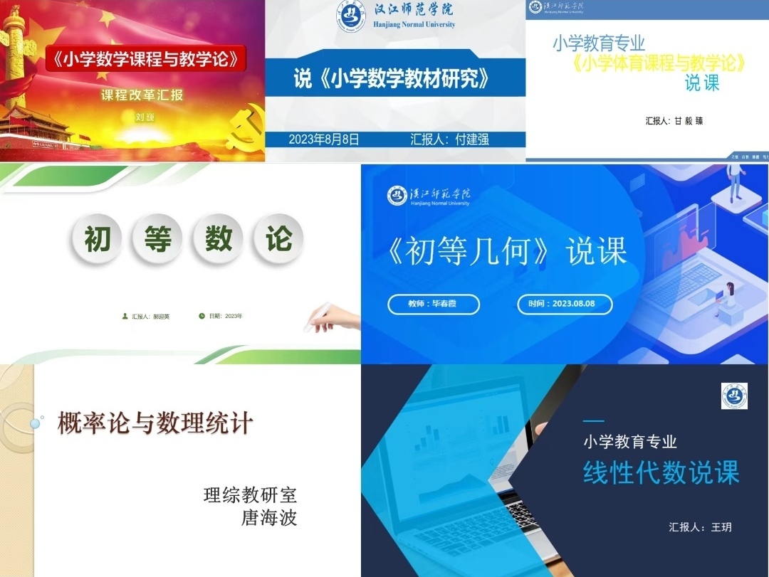 活动中每位教师充分发挥自身对小学教育专业建设、人才培养方案和课程建设工作的理解,始终围绕课程性质、课程OBE教学改革、课程思政、课程教学设计以及课程资源建设等方面进行了细致的阐述,其中郝迎英老师通过课程前期对员工学情的调研总结了《初等几何》课堂教学的痛点,在员工中心视域观照下,从课程目标、内容、教学方法、实施等多个环节逐一实现突破创新。此外,省级课程思政示范课负责人刘巍老师从理论建构、课程设计、实施、评价及资源建设等方面对《小学数学课程与教学论》课程改革作了详细汇报。说课结束后,每位教师依次展示了五样教学材料,并对其他老师说课提出了宝贵的意见和建议。