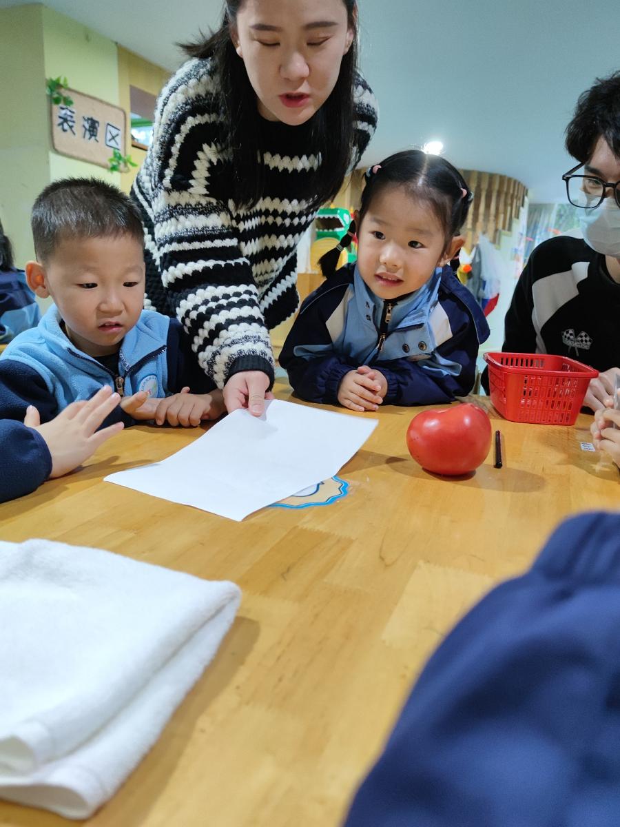 此次教研活动分三阶段开展。活动第一阶段,由学本21级马梓叶同学在桐华幼儿园中二班开展了以“流血的西红柿”为课程题目的健康领域教学活动,该领域活动旨在帮助幼儿从科学角度入手认识危险物品,实现自我保护;
