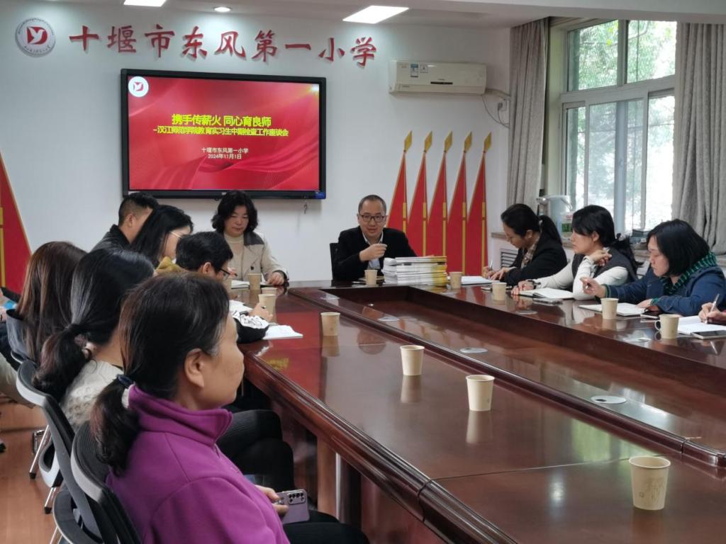 本次实习中期检查以座谈会为主要形式,东风第一小学副董事长陈艳荣、教务主任赵静、部分指导教师出席座谈会,全体实习生参会。