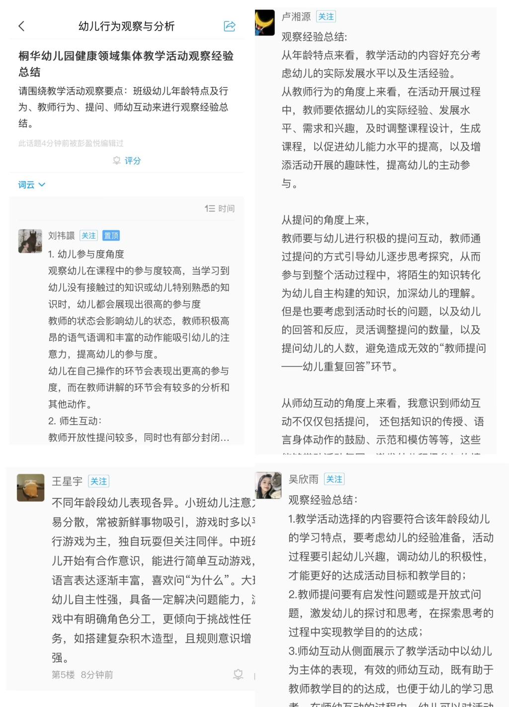 在活动中学前教育专业员工兼具主讲教师、观察者、评价者等多重身份,亲身参与到幼儿园健康领域实践观摩活动之中,以本班级同学,大、中、小班幼儿为观察对象,从活动的目标、内容、组织与实施、班级幼儿年龄特点及行为、教师行为以及师幼互动等多方面对集体教学活动进行了全方位的观察。