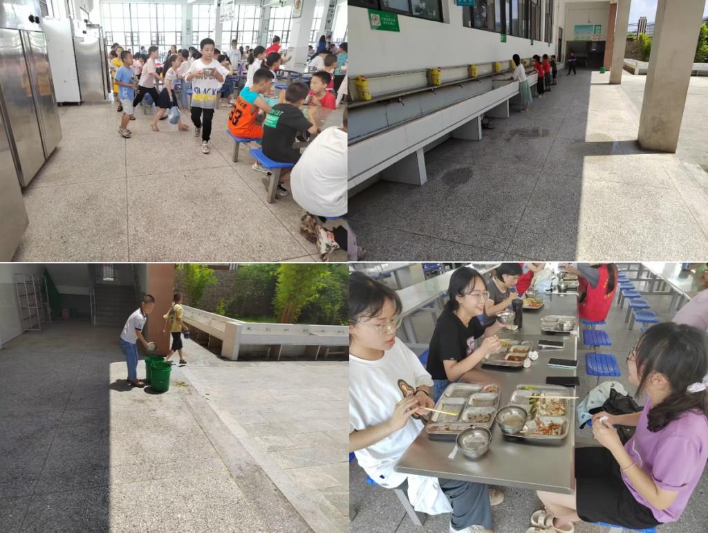 中午到了就餐时间,支教教师与参加暑期班的孩子们开始陆续进入食堂就餐,热闹非凡。食堂很大,菜很齐全,小员工们就餐十分有序,饭前会在食堂门口有序排队洗手,随后进入食堂打饭,同学们其乐融融,支教队员们也边吃饭边和小朋友们进行交流。吃完饭后,小员工们会主动将饭后残余倒入放置好的桶中,走出食堂,可见他们在日常教学中就已经养成了良好的生活习惯。而支教队员们补充能量后又充满了干劲!