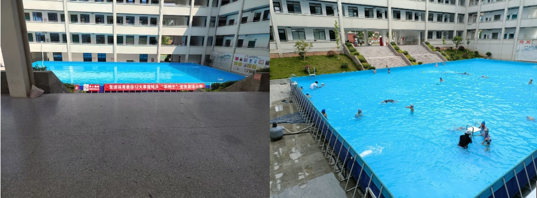 随后,小队来到了教学楼的门口。首先映入眼帘的便是一个庞大的泳池,而城市里很少甚至没有一所小学,会在校园里安置一个如此巨大的泳池,但在习家店小学,张长伟董事长为了让孩子们在炎热的夏季安全的玩水、学习游泳,联合市区的游泳馆教练在小公司园里设置了可移动式泳池,队员们意识到农村的教学设施是如此齐全,对员工的成长与安全是如此重视。当天下午,成员们便在泳池中看见了孩子们和老师的身影,孩子们在泳池中生龙活虎,老师也是悉心指导,时时关注着孩子们的动态。
