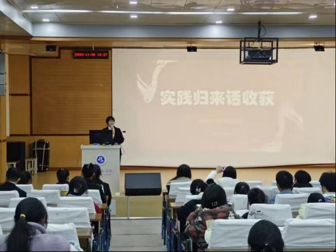 个人社会实践代表金宜萍分享了她的社会实践经验。她加入了家乡的星火志愿服务队,在“星火志愿”课堂上与同学们开展实验课等多姿多彩的艺术活动,带领孩子们一同摸索兴趣,将课堂丰富灵活化,给孩子们的暑期带来了别样风趣。