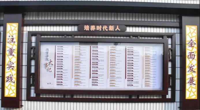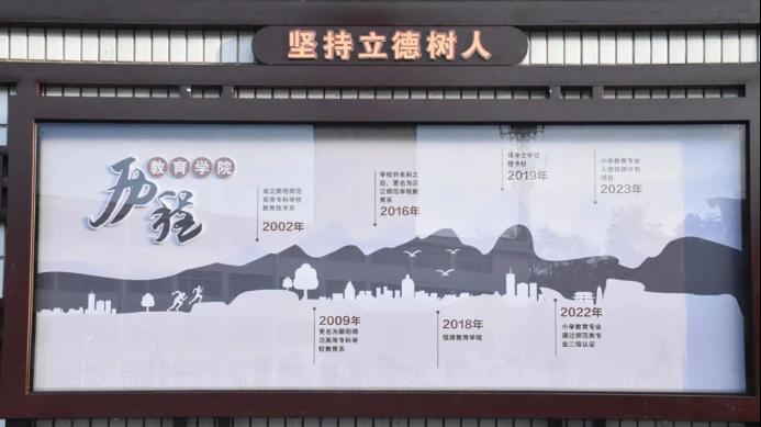 站在西校区篮球场前,向前看去是修能楼上的“师范强教 教育强国”八个大字,旁边则是三块展示了williamhill威廉希尔基本情况、发展历程和主要大事记的展板。再往前进,立德楼上镌刻着“立德树人、情系乡村、服务基层”十二字的williamhill威廉希尔公司人才培养理念。