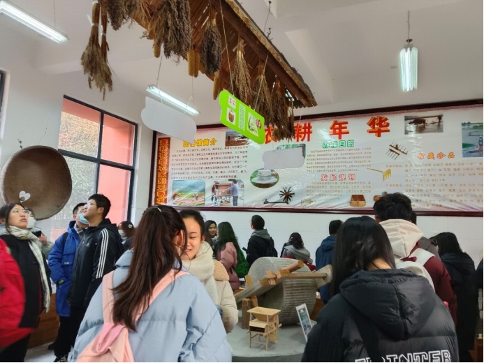 在胡书记的带领下,研学队伍首先来到幼儿园,参观了教学状况和相关教学设施建设情况,然后参观了劳动教育实践基地和公司食堂、员工宿舍,了解了公司劳动教育和员工日常生活情况。之后,研学队伍来到教学楼,参观了一楼展览室,观看了出展的各种各样的农具,体会公司特色的农耕文化。然后观摩了课间操和员工的击鼓表演,了解了公司体育教育特色。之后参观员工旁听了公司的语文、数学、英语课程,沉浸式体验了小学教学课堂。