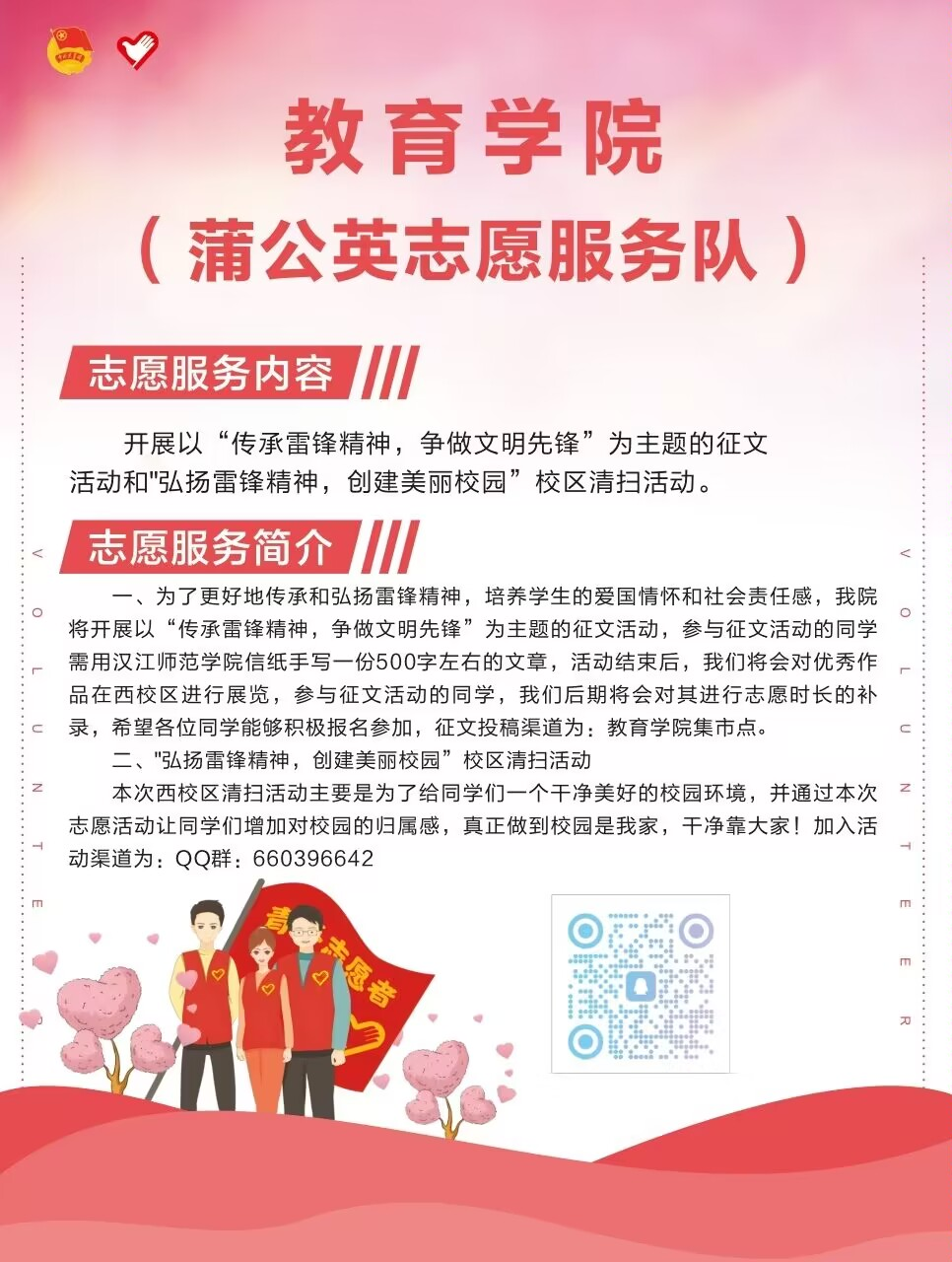 开展“传承雷锋精神,争做文明先锋”为主题的征文活动,传承和弘扬雷锋精神,培养员工的爱国情怀和社会责任感。组织员工志愿者开展“弘扬雷锋精神,创建美丽校园”校区清扫活动,不仅给校园带来了美化,更让同学们体会到了志愿服务精神的精髓所在,增加同学们对校园的归属感。