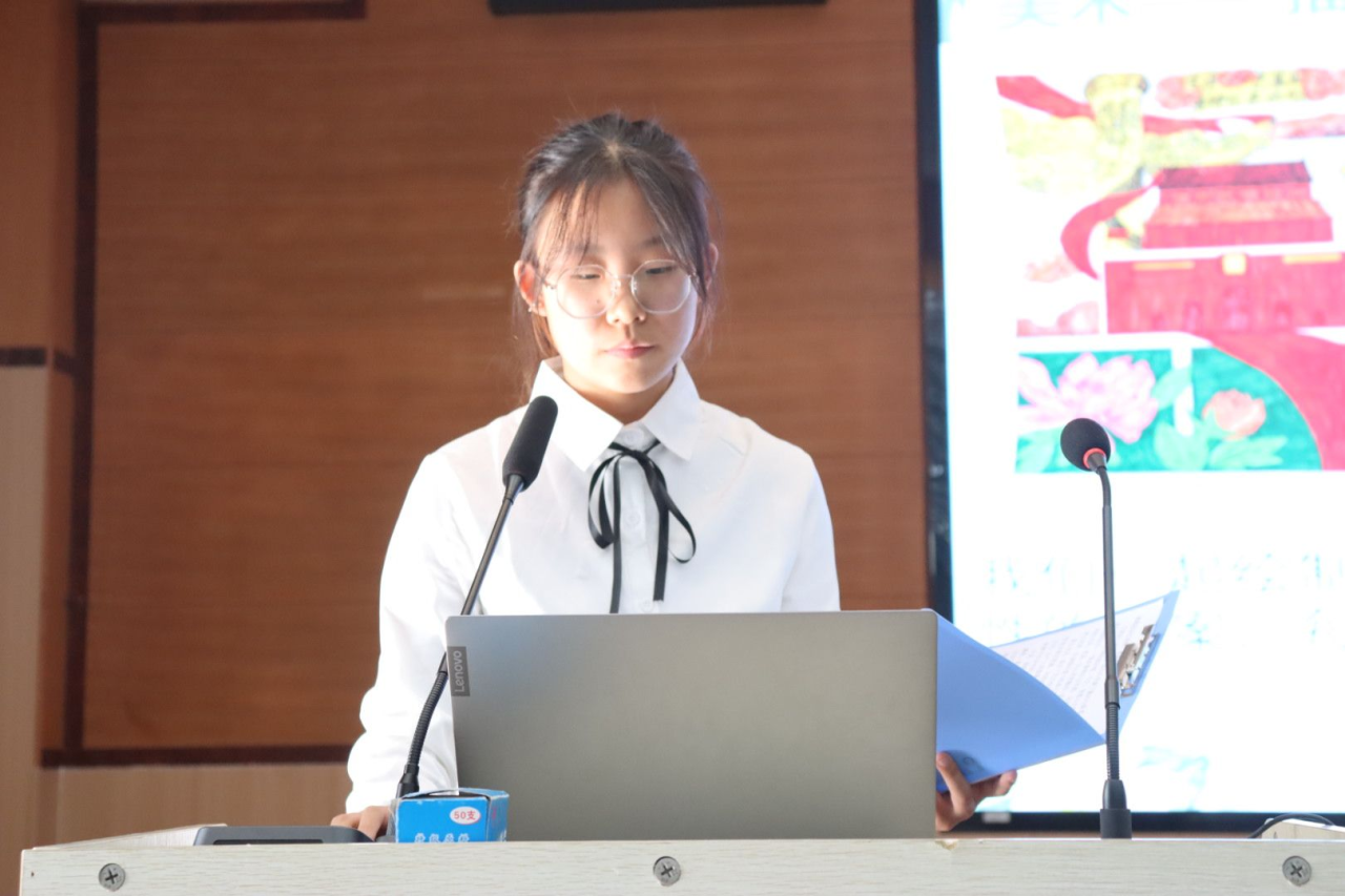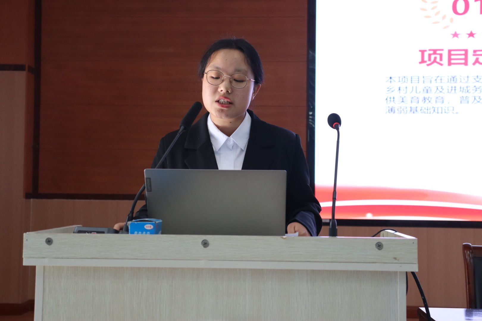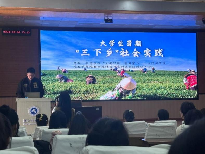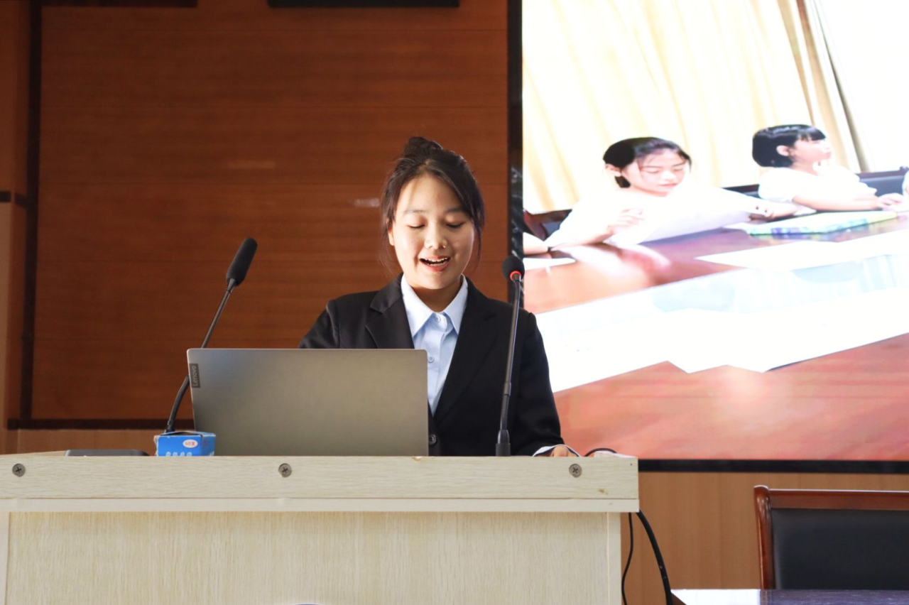 个人社会实践代表郭田甜分享了她响应“双减”政策,推动农村儿童艺术教育,通过美术、手工和体育等活动,提升了农村儿童的艺术修养和美感追求的事迹,同时也向乡村地区传播了红色文化和优秀传统文化。