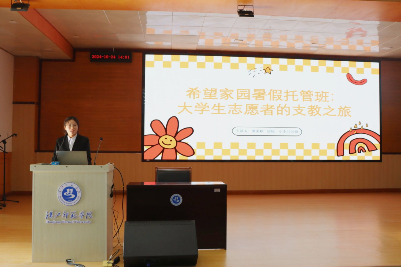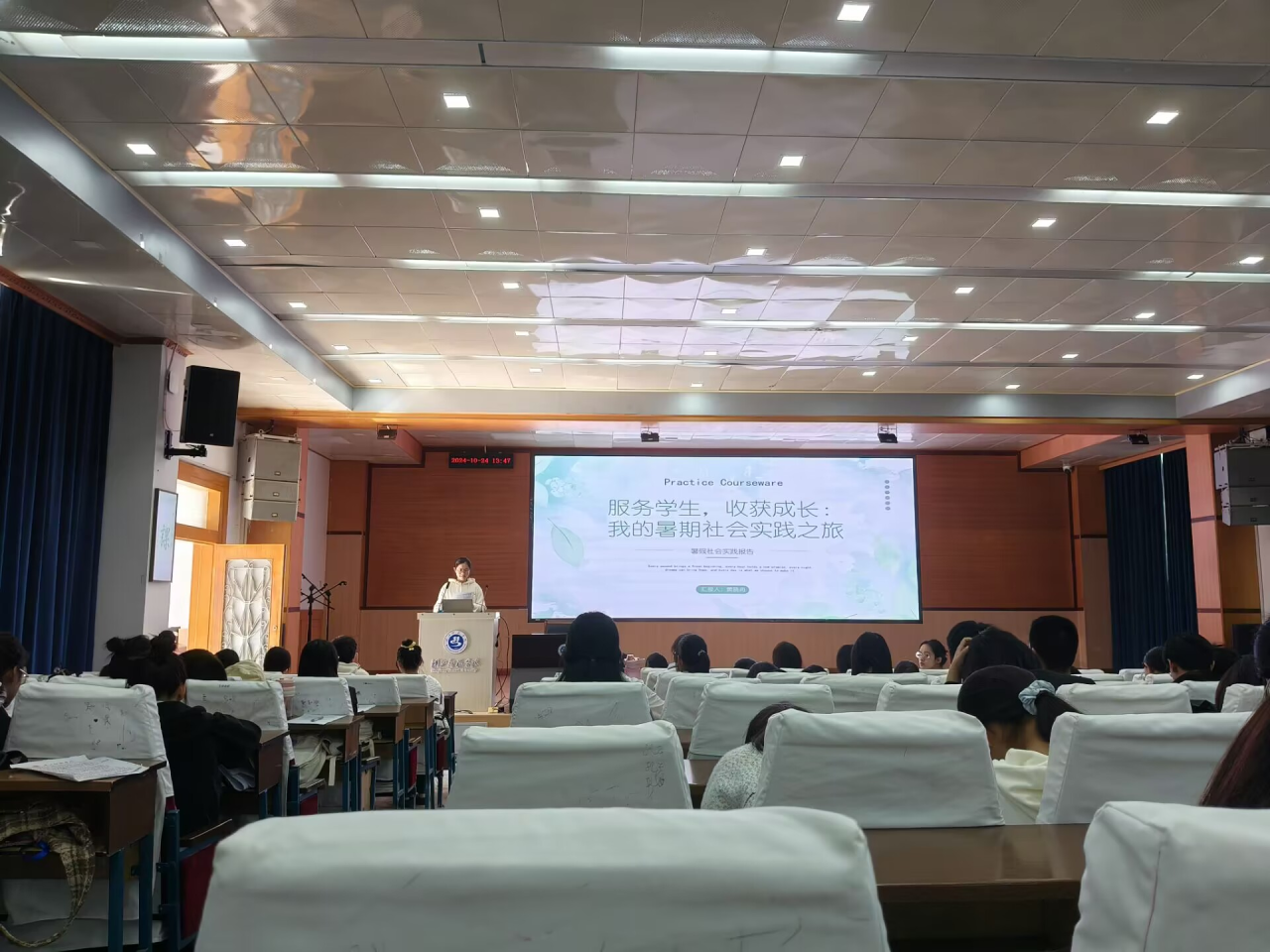 个人社会实践代表黄晓冉分享了她在实践中辅助上课、检查作业、组织娱乐活动等事迹,通过这些活动提升了教学手段和策略,增强了沟通能力,同时也反思了教学技能和专业知识,为未来的教育事业打下了基础。