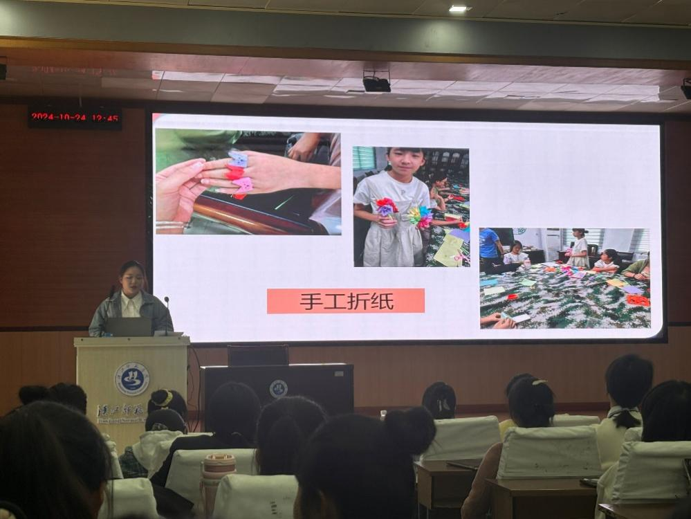 个人社会实践代表颜芬分享了她的社会实践经验。她在“爱心托班管”中开展了作业辅导、创新艺术活动和爱国教育,通过这些活动提高了员工们的学业水平和艺术素养,同时也增强了自身的沟通能力和组织能力。