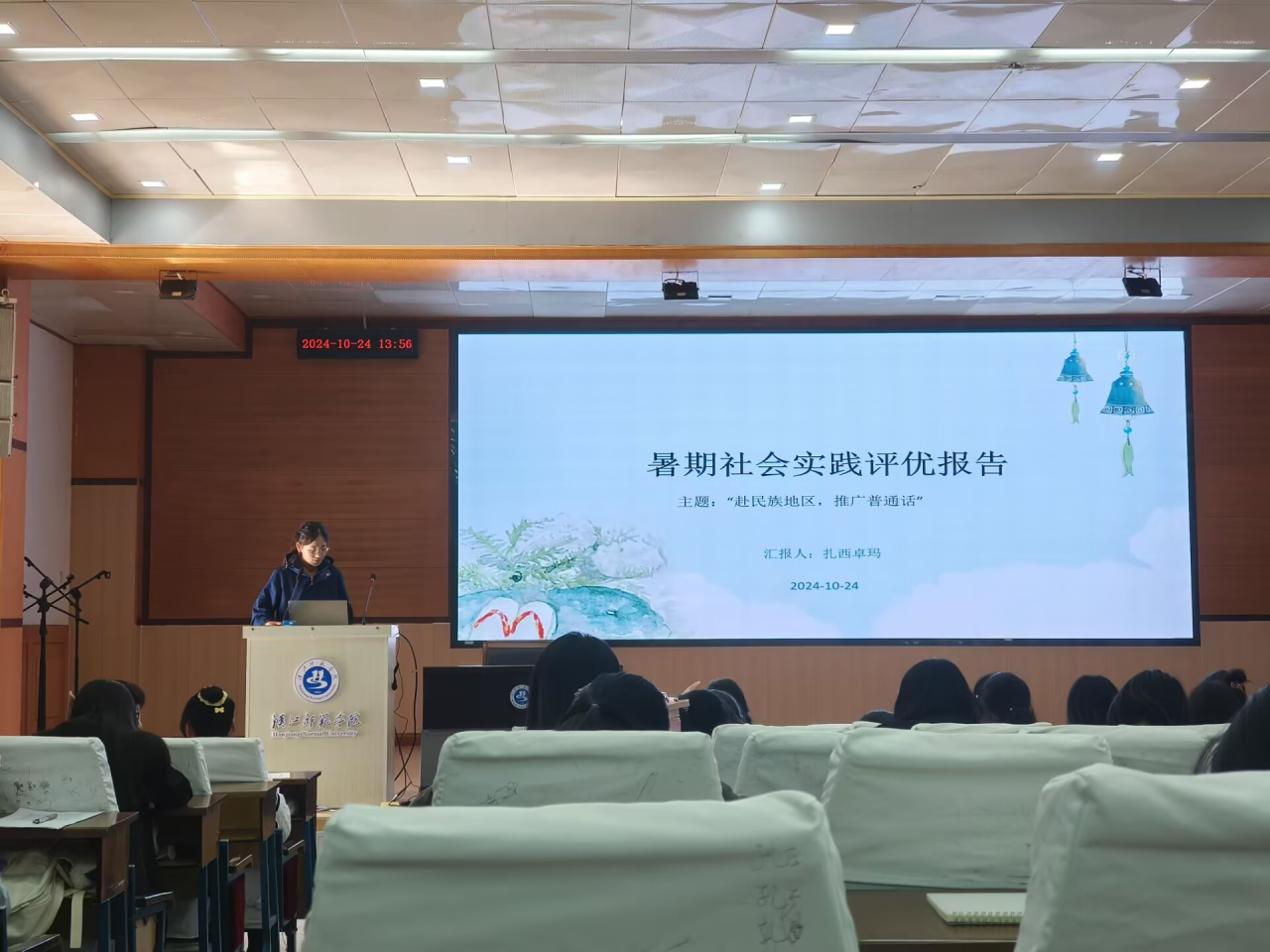 个人社会实践代表扎西卓玛分享了她的社会实践经验。她赴西藏地区推广普通话,通过教学活动和互动交流,提高了幼儿的普通话能力,促进了文化交流和民族团结,为孩子们的未来学习和发展打下了坚实的基础。