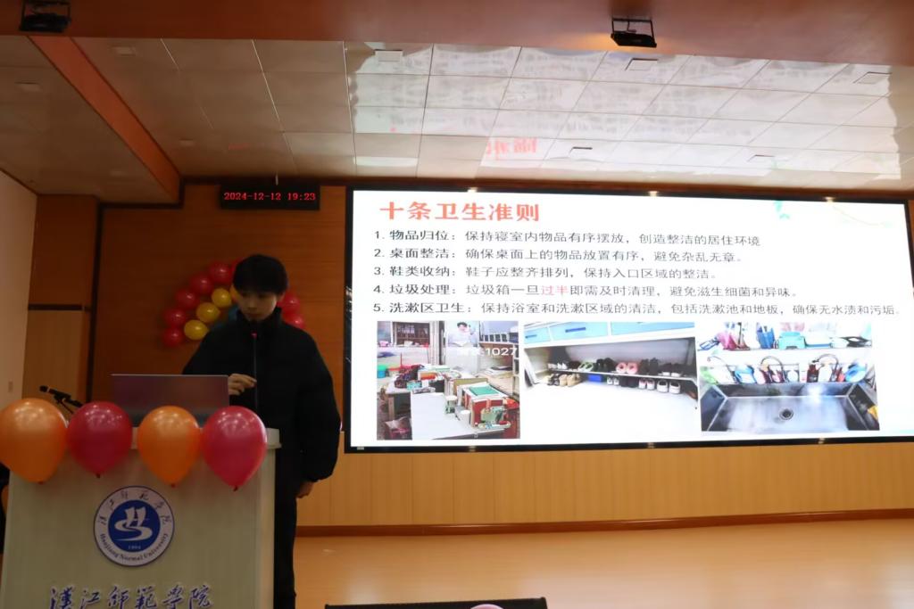 颁奖结束后,williamhill威廉希尔自律工作委员会借助这次机会邀请优秀寝室的寝室长代表——小教专升本2401班 潘磊同学分享经验。在演讲中,潘磊同学还提到了他在部队中的住宿经验以及如何同舍友相处。