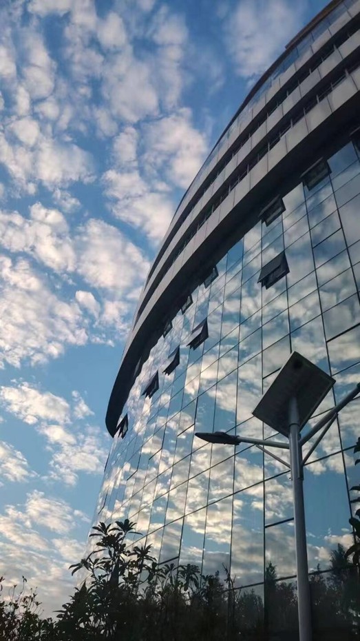 抬眼间,便被这一幕深深吸引。大楼的玻璃幕墙宛如一面巨大的明镜,将天空的云朵完整收纳。那形态各异的云朵,或聚或散,在玻璃上轻盈铺展,与硬朗的建筑线条相互映衬,刚柔并济。此刻,心似被一阵清风拂过,格外舒畅。忙碌与纷扰皆被抛却,只专注于这自然与建筑交融的景致。每一朵云都像是生活里不经意的惊喜,在这面“镜子”中诉说着宁静与美好。路灯默默相伴,周围绿植也似沉醉其中。我按下快门,定格这瞬间的心动。这张照片,承载的不仅是眼前美景,更是在喧嚣日常里寻得的静谧角落,提醒我于匆匆步履间,莫忘捕捉生活缝隙中的诗意与远方。