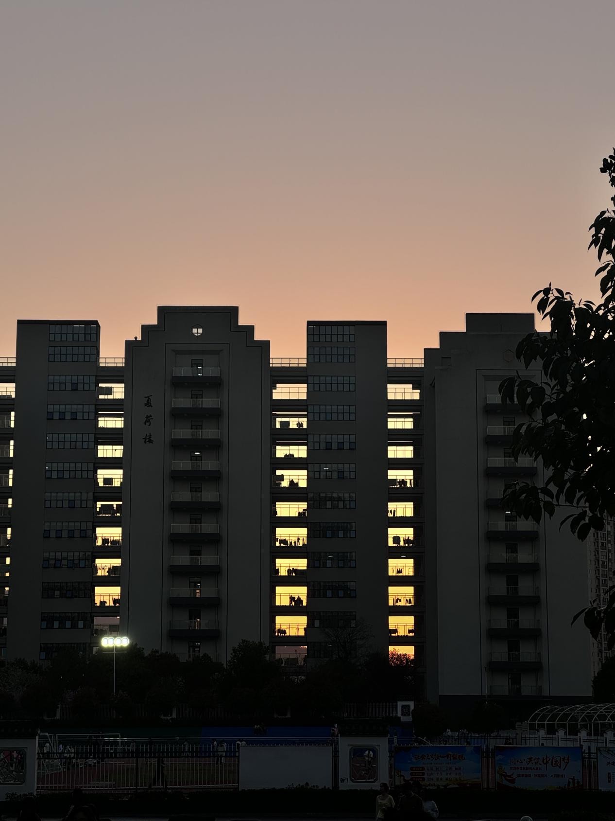 夕阳的余晖轻柔地洒在大地上,将天空晕染成一片迷人的粉橘色,如同一幅天然的瑰丽画卷徐徐展开。画面中央的“夏荷楼”巍峨矗立,规整的楼体呈现出沉稳而庄重的灰色调,在这黄昏的光影里,更显肃穆。一扇扇窗户整齐排列,此刻,暖黄色的灯光从窗内盈盈溢出,宛如颗颗温暖的星辰。那灯光,或明亮或柔和,似在无声地讲述着楼内莘莘学子的奋斗时光与青春故事。每一扇亮灯的窗户背后,也许是专注学习的身影,也许是热烈讨论的场景,满溢着蓬勃的朝气与求知的热情。在建筑的右侧,枝叶微微探出,为画面增添了一抹自然的生机。下方隐约可见的围栏与一些设施,暗示着这是充满活力的校园一角。整体景象在暮色与灯光交织中,既有黄昏的静谧悠远,又因那点点灯光而满蕴温情,将校园独有的人文气息与宁静氛围完美勾勒,令人心生向往。