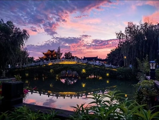 伫足于此景前,仿若踏入遗世桃源。天边晚霞如锦,粉紫交织,恰似仙人遗落的霓裳,轻柔铺展于天际;湖面如镜,倒映着桥上灯火与流云,波光潋滟,似有岁月低语。垂柳依依,宛如温婉女子于晚风中轻舞水袖,四周绿植繁茂,生机盎然,静诉生命蓬勃。此景如诗,撩动我心底柔弦,尘世纷扰瞬间消散,唯留安宁与欢喜。我沉醉于这自然与古韵交融之境,仿若与时光达成默契。愿将此刻美好镌刻心间,于喧嚣中守此清幽,让心灵寻得永恒栖息之所。