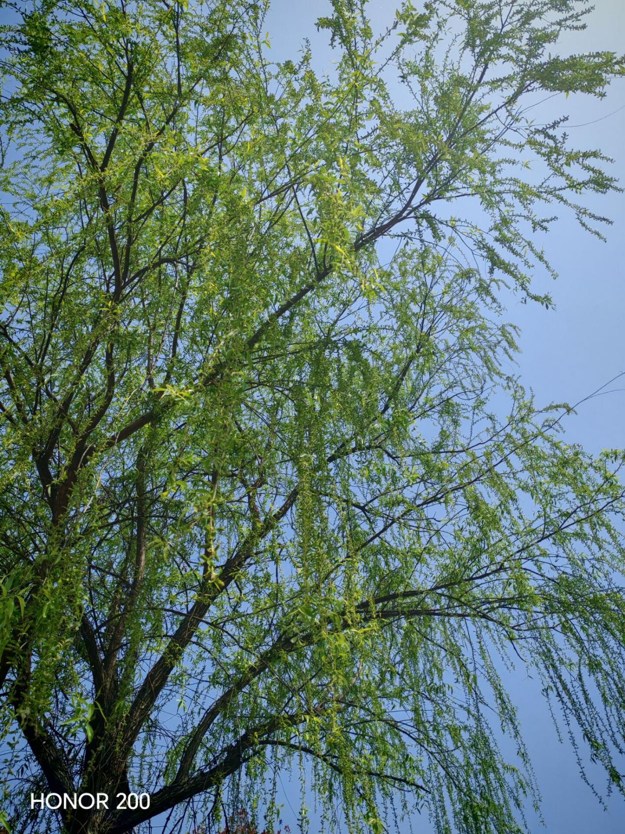 蓝天如幕,柳树亭亭。新绿的叶片似翠玉轻缀枝间,细长柳枝垂落,仿若绿瀑流泻。微风轻吻,柳枝摇曳生姿,似在与天空私语。