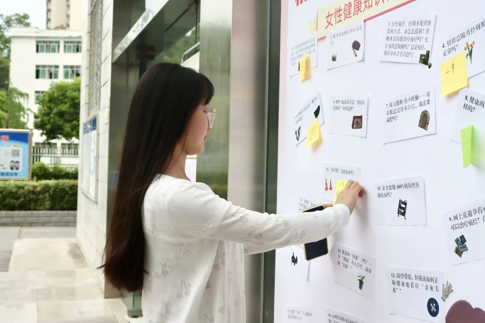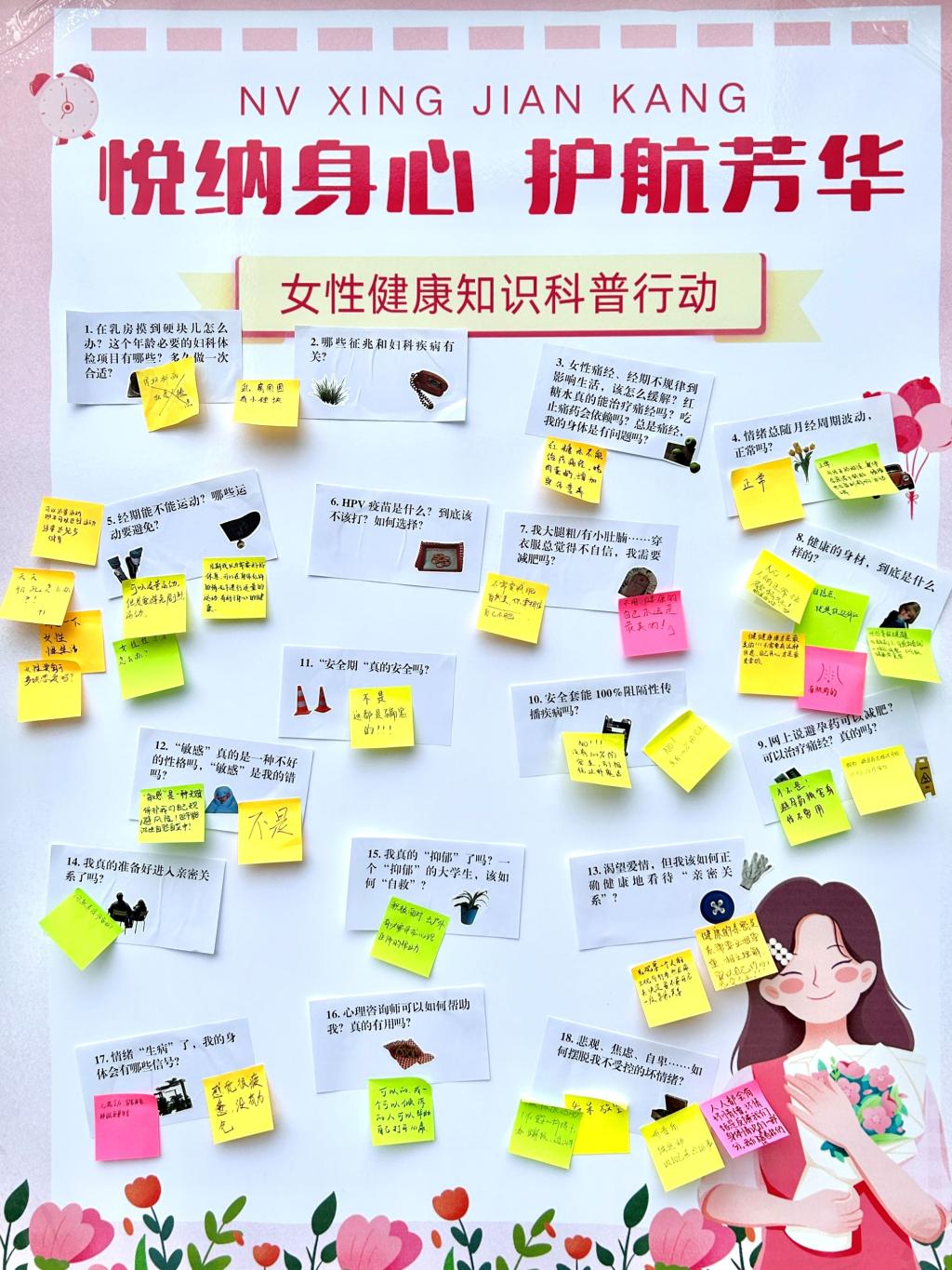 活动现场,一块块 KT 板格外引人注目,上面粘满了关于女性生理与心理健康的疑问和误区。路过的师生纷纷停下脚步,拿起笔,在 KT 板上留下自己对这些标签的看法和回答。有的写下暖心鼓励,有的分享专业见解,每一笔每一划,都是大家对女性健康的关注与思考。