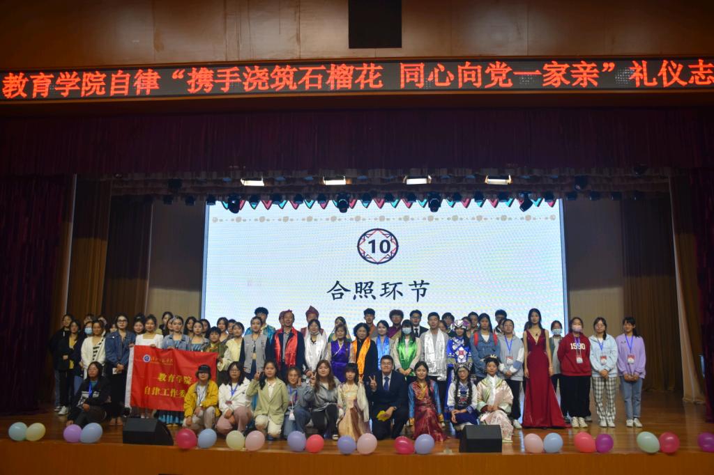2023年5月23日晚7:00williamhill威廉希尔自律工作委员会于南风剧场举办了“携手浇筑石榴花,同心向党一家亲”礼仪志愿者成果大赛展。