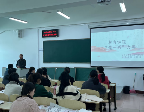 本次比赛包括初赛、复赛两个环节。初赛共有300余人参加,经过初赛选拔,共有43名优秀选手进入硬笔字、粉笔字、毛笔字、简笔画四大项决赛。15点00分,随着现场评委老师宣布"比赛正式开始","三笔一画"总决赛便拉开了帷幕。每个参赛选手都全神贯注于自己的作品之中。老师们也在比赛现场关注着每个参赛选手的作品完成进度。每个参赛选手都自信满满:毛笔字赛区,选手们挥洒自如;粉笔字现场个个从容淡定钢笔字场区,字如其人,刚劲有力:简笔画赛区"下笔如有神"。