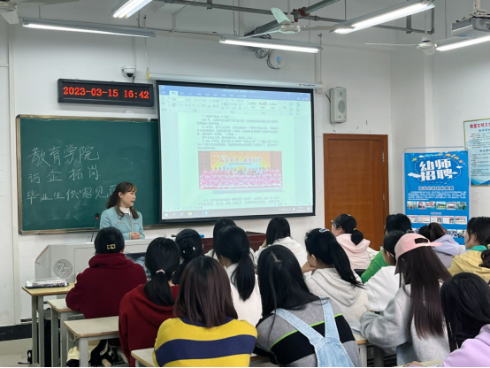 下午四点二十分,在尚艺楼A202召开毕业生与企业面对面宣传招聘会,学工办主任张宇、辅导员孙文、郭玉婷参加会议。会上园方负责人从个人发展前景、幼儿园平台建设和阶梯式薪资发展待遇给员工进行详细介绍,员工也和各位园长进行了热情交谈和沟通。