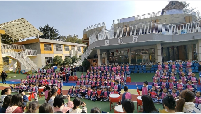 然后,在幼儿园的绿荫广场上观摩了户外课间活动和中大班打击乐、大合唱展示活动。