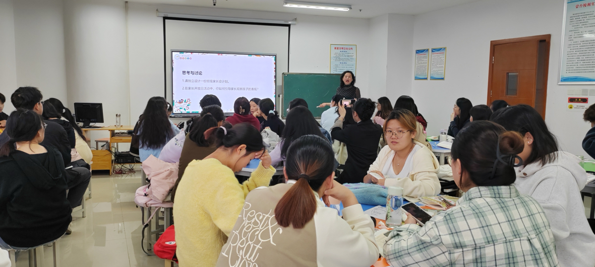 10月12日上午在尚艺楼B804,《家园共育与家长工作》的课堂,桐华幼儿园汤园长受邀为同学们带来了一堂主题为“幼儿园家长工作的途径与方法”的生动课程。