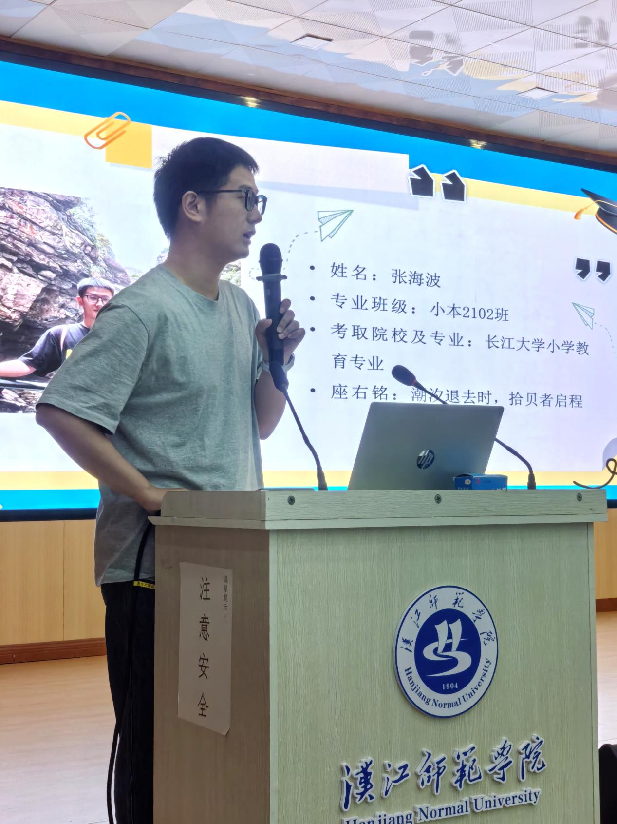 小本2102班的张海波同学分享了长江大学小学教育专业的备考经验,特别提到考研与考编的兼顾策略。他指出,考研后期可同步关注校招信息,利用考研积累的教育学知识体系助力考编笔试,同时需针对性补充综合知识。在时间管理上,他建议优先明确核心目标,避免贪多求全,并结合自身调剂非全日制的经历,强调合理取舍与职业规划的重要性。