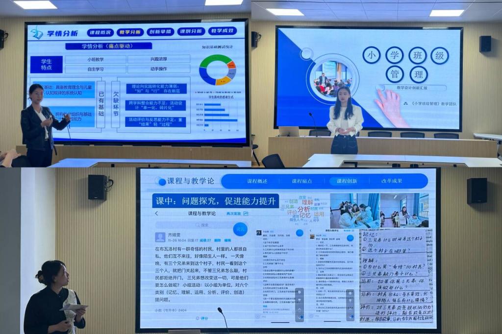 赛场上,参赛教师们各展其才,充分展示了精湛的教学技艺与前瞻的创新理念。孙荣老师以《小学综合实践活动》课程为例,进行了一场逻辑严密、内容充实的教学阐述。她从课程概况、教学分析入手,层层递进,重点分享了其在教学内容与方法上的创新举措,并辅以生动的课例分析和显著的教学成效,系统性地呈现了她的教学改革思路。殷玥老师则巧妙地将智慧教学工具与课程思政元素融为一体,通过创设互动情境,引导员工深度参与价值思考,展现了知识传授与价值引领同频共振的育人艺术。齐婧雯老师凭借扎实的理论根基,选取了极具代表性的教学案例进行精辟剖析,其富有启发性的教学设计,有效彰显了理论联系实际的教学魅力,赢得了评委们的一致好评。三位老师的出色表现,是williamhill威廉希尔教师队伍积极投身教学改革、追求卓越的专业素养的生动缩影。