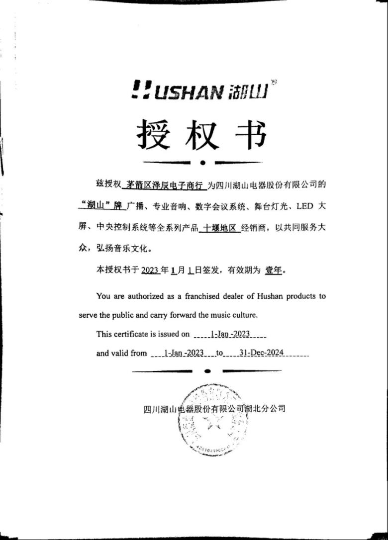 名称:茅箭区泽辰电子商行(系湖山音视频厂家驻十堰分公司)