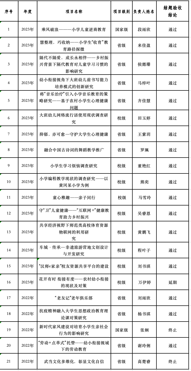根据湖北省教育厅《关于做好2024年老员工创新创业训练计划立项和结题验收工作的通知》和教务处相关工作通知,公司于2024年6月2日对今年结项的21项项目进行了评审,从创新性,应用性、选题价值、研究基础、内容设计、研究方法、条件保障等多方面进行考量,现对结项情况予公示。