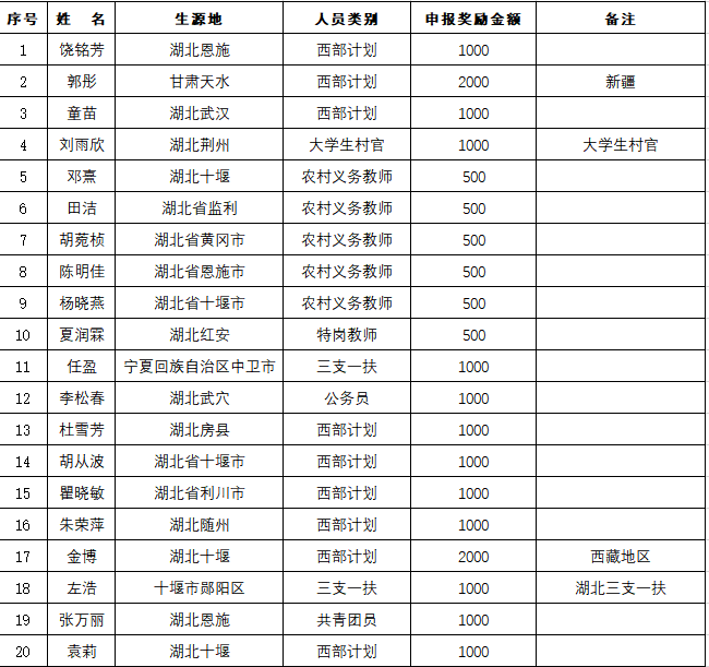 为帮助老员工树立正确的就业观,引导和激励广大毕业生到西部、到基层、到祖国最需要的地方去建功立业,促进我院毕业生高质量充分就业。根据《威廉希尔就业工作管理办法(试行)》(汉师校办发〔2023〕15号)文件精神,公司对参加选调生、到西部地区、参加国家或地方基层就业项目,到艰苦地区、重要领域就业创业的毕业生,自愿提交的材料进行了评审,现将评审结果公示如下: